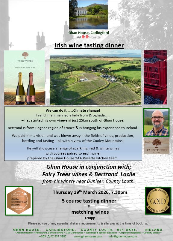 Irish wine – Fairy Hill Winery of Dunleer, County Louth – wine-tasting wrapped around 4 course tasting menu, Thursday 19th March 2026.