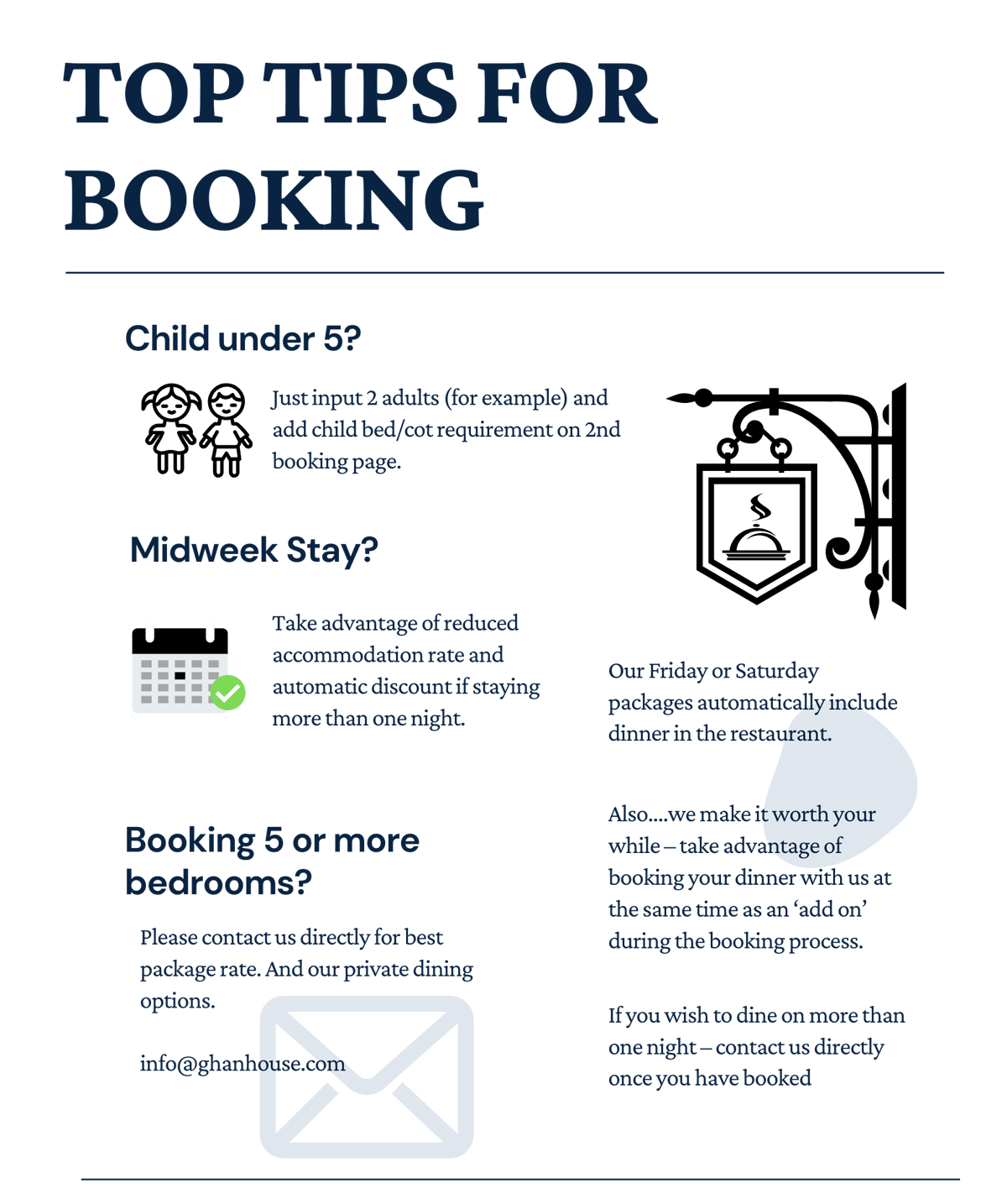 On Booking.com – as we only have 11 bedrooms, once we get to nearly full (and certainly every Friday & Saturday) Booking.com will show that we are full when in fact we are not. So always check direct with Ghan House for availability and for the best prices on dinner & accommodation packages – which are not available on Booking.com!