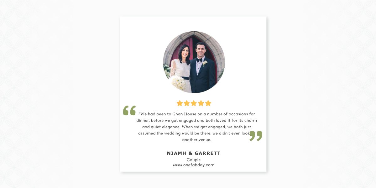 We recently celebrated our wedding reception at beautiful Ghan House in Carlingford and I can honestly say it was a perfect day from start to finish. Paul and all the staff were brilliant – so welcoming, helpful and friendly to us and all our guests. Paul – thanks again for all your helpful advice on the run-up to the big day. We had a few last-minute changes and requests – everything was accommodated with no fuss. Ghan House is an excellent setting for a wedding for many reasons: the house itself is gorgeous, the rooms in both Ghan House and the garden are beautifully decorated, really comfortable and the bathrooms are lovely. The food was excellent and we were able to adapt the menu to suit our preferences – the Cooley Beef in particular was delicious. The location is perfect; despite being in bustling Carlingford the house and grounds are secluded, private and very peaceful, there’s plenty of photo opportunities in such a setting. The advantage of having exclusive use of the house and grounds for the big day meant that guests could choose to chill out in the wee bar, listen to music in the garden or just explore the lovely surroundings and relax! It honestly was the most chilled-out, amazing and enjoyable day!